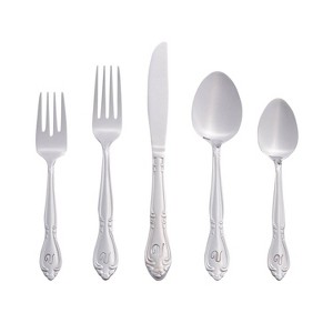 This RiverRidge Rose 46 piece flatware set brings elegance to your table. Each piece is permanently stamped with your chosen letter, adding a personal touch to every meal. This set includes 8 place settings and 6 serving pieces, perfect for family meals and gatherings. The set includes 8 of each dinner forks, spoons, salad forks, teaspoons, and knives, plus a one serving spoon, slotted spoon, gravy ladle, serving fork, butter knife, and sugar spoon. It's dishwasher-safe for easy cleaning. Our Rose Flatware Set offers versatility for all your dining needs. Crafted from durable heavy gauge 18/0 stainless steel, each piece features a polished mirror finish that resists tarnishing. The traditional shape and delicate rose blossom design create a timeless look that suits various table settings. Ideal for both everyday use and special occasions, our flatware set is a versatile choice for newlyweds or new homeowners.