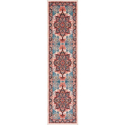 Introducing our stylish runner rug from Turkey, crafted with care using power loomed polyester. Measuring 2 feet 2 inches by 9 feet, this rug adds a touch of traditional charm to any hallway or entryway. The delightful mix of red and blue complements a variety of decor styles. With its convenient washable feature, maintaining its fresh look is effortless. The slip resistant design ensures safety and comfort underfoot. At a quarter-inch height, it sits elegantly flat, making it an ideal choice for busy areas in your home. Enhance your space with this versatile and functional addition that seamlessly fits in, while providing a cozy and inviting atmosphere.