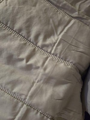 [This review was collected as part of a promotion.] This quilt feels so nice when I climb into bed. It's soft and warm yet not too warm. It's not super heavy like a lot of quilts. The simple design goes perfect with our bedroom. To clean just toss in the washer!