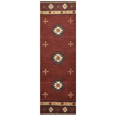 Add the lure of the southwestern symbols woven in shades of rich red, burgundy, tan, rust, navy, and calming sage in this Alora Décor Ryder Rug. Made from hand-tufted, 100-percent wool for warmth, and hand-serged edges for quality, and beauty -- cozy and welcoming. Designed to compliment your southwest or lodge style home or office décor.