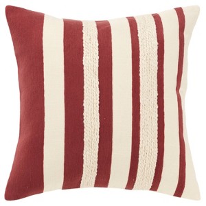 If you're looking for the perfect accent pillow to add a pop of color to any room in your home, you've come to the right place! This 20" x 20" woven pillow in 100% premium cotton is both trendy and stylish in a modern farmhouse design of contrasting crimson embroidered, graduated stripes against a soft ivory background to transform any living space with polish. The two-color styling creates dimension, while the coordinating solid back with hidden zipper closure ensures a polished finish. The combination of ivory and wine will add sophistication and warmth to any cozy home décor.