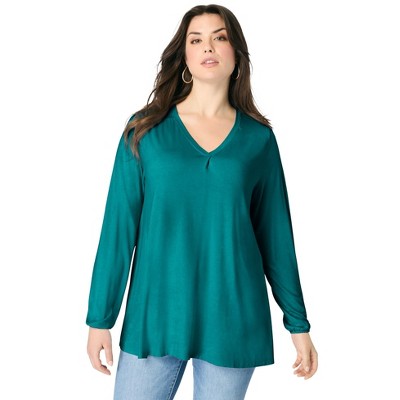 This relaxed tunic features a flattering V-neckline with a Henley placket and a stylish front bib with shirring under the bust. Complete with elbow-length sleeves and convenient side seam pockets, it offers both comfort and functionality in a casual, easy-to-wear design.