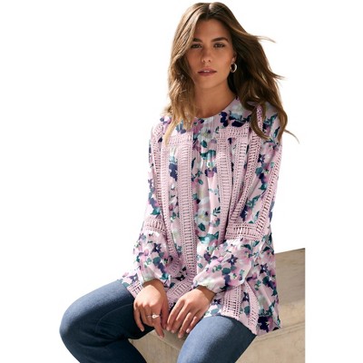 Roaman's Lace-Trim Blouson-Sleeve Top - 28 W, Cloud Blue Watercolor
