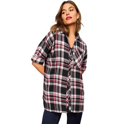 Roaman's Plaid Flannel Pintuck Blouse - 28 W, Black Pink Plaid