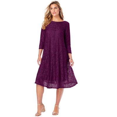 Roaman's Plus Size 3/4 Sleeve Allover Lace Swing Dress - 22/24, Dark Berry