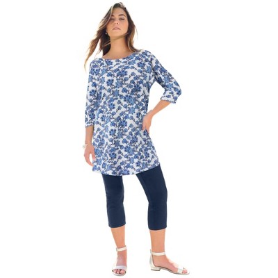 Note that these run big, and the neckline plunges deep enough that some bras may show. The side seams run straight from the underarm with no shaping. A 2X (chart says bust 53-55") measured 63" around the hem, and a 3X (chart says bust 57-59") measured 66". That said, the shoulder seams sit more or less right so ordering more than one size smaller than you want may be snug there.