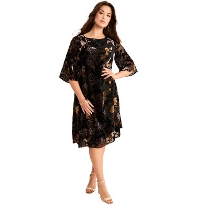 Roaman's Plus-Size Velvet 3/4 Sleeve Burnout Overlay Dress With Sheer Sleeves