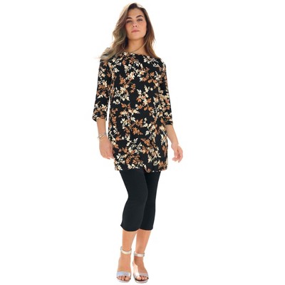 This flowy tunic with three-quarter sleeves is designed in a just-right length for easy outfitting with leggings and jeans.