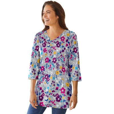 This flowy tunic with three-quarter sleeves is designed in a just-right length for easy outfitting with leggings and jeans.