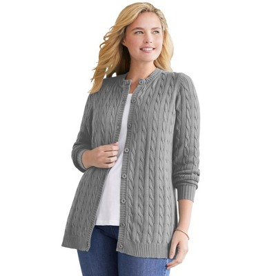 I bought this sweater in a powder blue and a navy. Because this is shipped to you from Roaman's (a plus size company), their sizes run larger. I ordered a 1X which = 22/24 size. To be certain, you can go to the Roaman's website and check out their size chart. The 22/24 fit me fine, typically I get an 18/20 from Target. Material looks great, it's light weight but not see through.