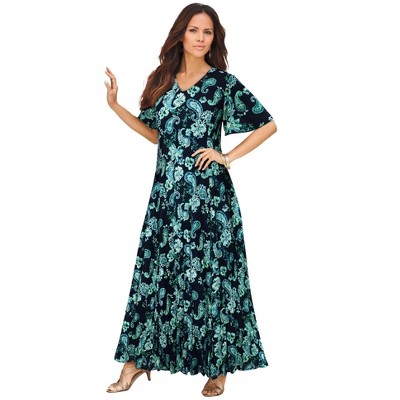 Roaman's Plus Size Hand Crinkled Flutter-Sleeve Maxi Dress - 42/44, Navy Bold Painted Floral