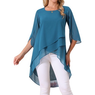Standout and shine in this bold sequin boatneck tunic with three-quarter length sleeves. Featuring a relaxed silhouette and a handkerchief-hem, this polished yet undeniably fun tunic was made for a night out on the town.