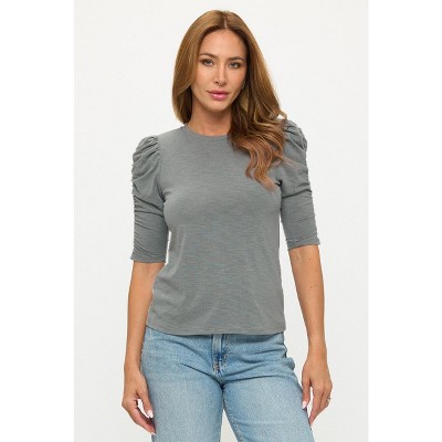 A feminine top full of delight with pearlized buttons, pleated front and back yokes and three-quarter sleeves. The soft jersey fabric flows beautifully and the delicate details like the lace-trimmed sleeves and hem add just the right amount of romance.