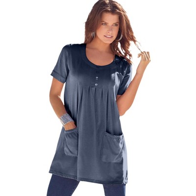 We gave this top two pockets and decorative buttons for a little extra style. It's shaped to suit you with front pleatsand a 34" tunic length that's just right for wearing over your favorite bottoms. Loose yet stylish, this is sure to be a favorite.