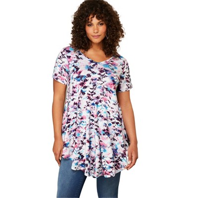 Note that these run big, and the neckline plunges deep enough that some bras may show. The side seams run straight from the underarm with no shaping. A 2X (chart says bust 53-55") measured 63" around the hem, and a 3X (chart says bust 57-59") measured 66". That said, the shoulder seams sit more or less right so ordering more than one size smaller than you want may be snug there.