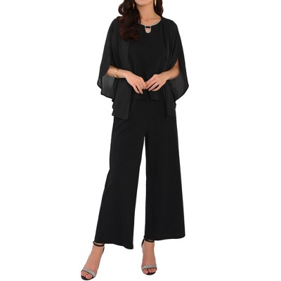 Made of lightweight georgette, this ensemble embodies effortless elegance. Tiered short-sleeve overlay, asymmetric tunic tank with capelet short sleeves, straight-leg elasticized pants..