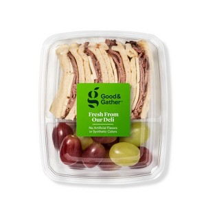 Keep yourself fueled during a busy day with a Roast Beef and Sharp Cheddar Snack Box from Good & Gather™. This boxed lunch comes fresh from our deli, packed with a sandwich made up of sliced roast beef and sharp cheddar cheese on flatbread and a side of red and green grapes. The sandwich is cut into quarters for easy eating in the car, and the box is a great size to carry with you in a purse, work bag or backpack. The sandwich and grapes contain no artificial flavors or synthetic colors, and the box is reclosable so you can keep fresh whatever you don't finish as you go about your day.