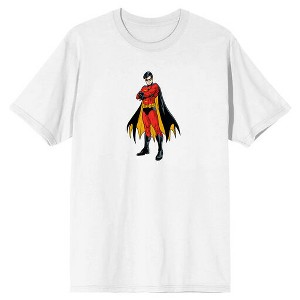 Channel your inner superhero when you wear this men's fun graphic t-shirt! The big colorful image has been professionally printed and applied so it will last long enough to get you through any adventure life throws your way. Made of 100% preshrunk cotton this white DC Comics fan apparel features short sleeves for comfort and style in any weather. It can be machine washed with like colors then tumble dried for easy care. As an officially licensed product the Robin power pose t-shirt makes a great gift for any fan of Batman's faithful sidekick.