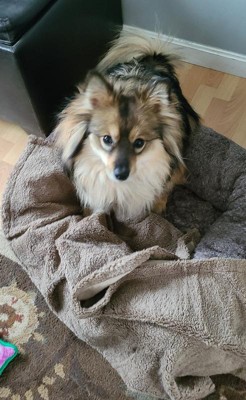 I received this medium waterproof pet blanket for free from the Hey, Bullseye sampling program in exchange for my honest review. One side is a very soft plush blanket, the other side is more suede like. The suede side does have a crisp crinkle sound, not sure if that will go away over time with use and washings. The crinkle sound is not very loud. It is light weight. The medium is 30 x 40" in size. The coloring of the plush is more of a light cocoa brown. The suede side is a few shades lighter. The tag does say that it is machine washable and dryable. We did not test it to see if it was truly waterproof. We tried placing it in a couple of different areas to see how it fit and how the pets took to it. We placed it over their bed. Our toy aussie sat but did not relax. Our pomsky tried to remove it. She did not care for it covering her bed. The medium size fit perfectly in their crate. They have a 42” x 28” wire crate. The toy aussie was fine with it, our pomsky would not leave it in the crate. We laid it on a chair and our pomsky did not want it there. We placed it on a storage ottoman and the cats inspected it but did not settle. Through all our trial placements, our pomsky scratched at it and the blanket was still in good condition and had no tears. When I flipped the blanket to the suede back side and inspected the stitching it was secure but I noticed in the corner there is a lip. If my pomsky discovers this she will focus on it and destroy it. This is not something I will be leaving out, this will be a throw that I take out to cover the sofa during inclement weather. It would be great for use in the car to cover the seat.