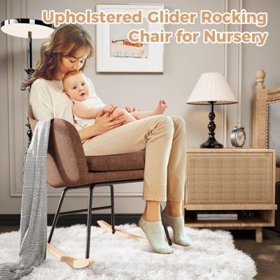 This modern upholstered glider rocker chair features an ergonomic high backrest and curved armrests, delivering exceptional comfort and support. Perfect for rocking your baby to sleep during naptime or enjoying a relaxing read. The wood - tone legs add a touch of elegance, effortlessly complementing your home decor while enhancing safety and coziness£¬Ergonomic Design&Ultimate Comfort.