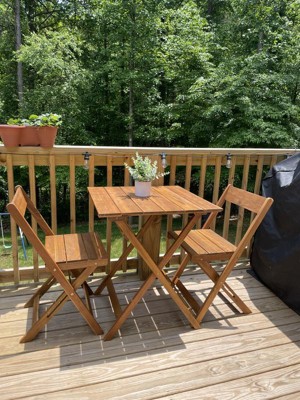 A: We're so glad to hear you’re enjoying the set—thanks for your purchase! To keep your acacia wood furniture looking its best, wipe it down regularly with a clean, damp cloth or use a soft damp brush to remove dust and pollen. For deeper cleaning, such as removing stains, mold, or mildew, use warm water and a mild natural soap with a soft brush. Be sure to avoid soaps that contain ammonia or silicone, as they can strip the protective outer layer of the wood. If you’d like a care guide or have any other questions, feel free to contact us at consumersupport@linon.com or 800-262-1852 (Mon–Fri, 9am–5pm EST)—we’re happy to help!