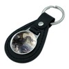 This keychain key fob is leather and metal, the design is resin topped and mounted on a sophisticated black leather backing. The silver plated hardware and key ring give it that extra touch of class. The keychain is approximately 1.5" (3.8cm) x 2.5" (6.4cm) in size, and the design is approximately 1" (2.5cm) in diameter.