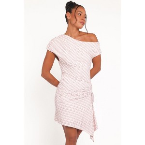 Step into the spotlight with the Rois Mini Dress in a vibrant pink stripe print. This eye-catching piece features an off-shoulder design with an asymmetrical neckline that adds a modern twist to a classic silhouette.