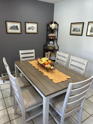 This dining set combines rustic charm with modern functionality, making it a perfect addition to any kitchen or dining area. Guests appreciate its sturdy construction, elegant design, and the bright grayish-white distressed finish that enhances the room's ambiance. While some have noted the firmness of the cushions and minor assembly issues, the overall quality and aesthetic appeal make it a highly recommended choice for those seeking style and comfort in their dining space.