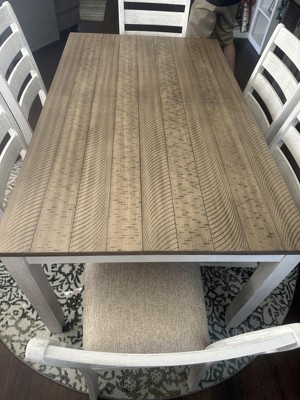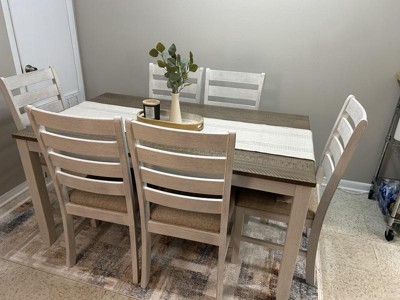 I love the beachy look. Really compliments our dining area. Chairs and table feel solid. Happy with our purchase. Delivery was great too.
