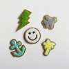 - Cheerful adhesive patches with fuzzy texture and glitter edges