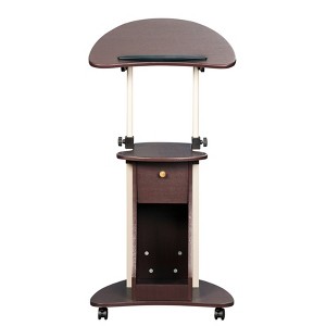 The Techni Mobili Deluxe Sit-to-Stand Rolling Laptop Cart with Storage saves space while providing the laptop or writing setup you need. The table panel tilts so you can adjust it to the most ergonomic, comfortable working angle. It also features a safety edge-stopper to prevent objects from sliding off when tilted. You can easily adjust the table height between 31.5 and 45.5 inches with dual adjustment knobs. There is an open storage compartment and a closed storage compartment with bottom hinges. Two of the fours non-marking nylon casters include locking mechanisms. The table and closed storage top and bottom shelves each have a 20 lbs. weight capacity and the base of the cart has a 30 lbs. weight capacity and is made of MDF panels with a moisture laminate veneer atop scratch-resistant powder-coated steel frame . Color: Chocolate.