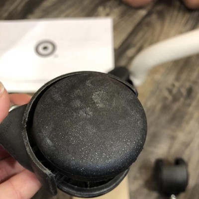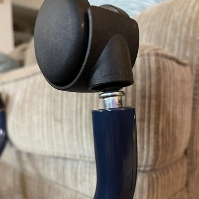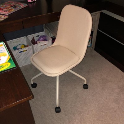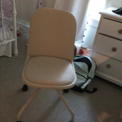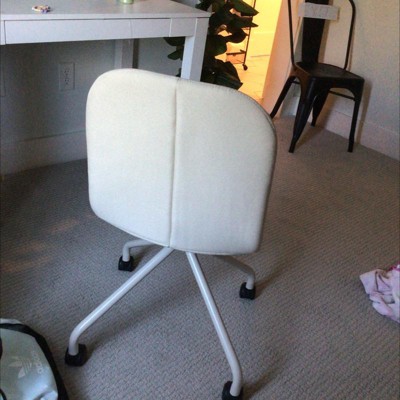 A: The desk chair is supported on sturdy metal legs for durability and stability.