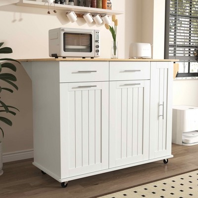 - Blending vintage charm with modern function, this kitchen island features a smooth painted finish, embossed panel detailing, and elegant gold-tone knobs. Its retro-inspired design brings a refined, classic aesthetic to your cooking and dining space.