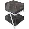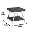 Silvershield? Tops give realistic wood look while resisting stains and scratchesConstructed of chrome with Silvershield? tops and engineered woodsSilvershield? Tops give realistic wood look while resisting stains and scratchesStyling details include rustic appearance combined with canted chrome legs, simulated chevron veneer patternBottom shelf offers space for storage or display
