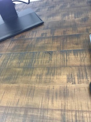 I ordered the Weathered Brown color. The color has a bit more of a dark walnut color to it then I figured from the pictures. Overall, the desk is sturdy, well made and only took me about 45 minutes to assemble single handed. Desk came very well packaged, not damaged at all upon delivery. The tabletop is not a smooth flat surface due to the rustic appearance. There are some ‘natural’ dips, and grooves. However these are not very significant. My monitors, keyboard and mouse are lay flat and run smoothly over the tabletop.