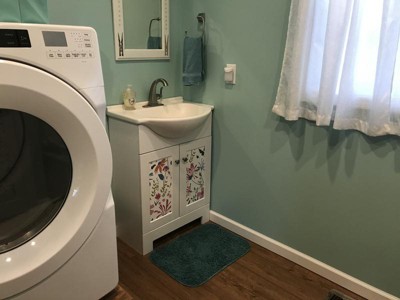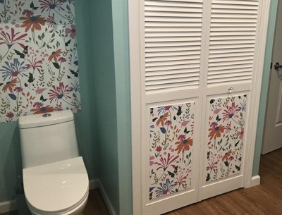 I really like the colors and pattern of this PSWP. I had hoped to use it in a small area of my laundry room/half bath. I couldn’t get it on the wall behind the toilet as I hoped, so I ended up compromising. I left a piece on the wall and then put small pieces on the closet door and the vanity door. It still adds some extra cooler and much needed patter to an otherwise plain room.