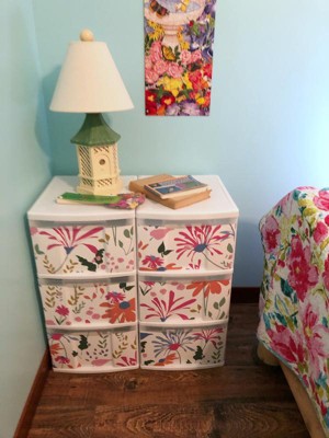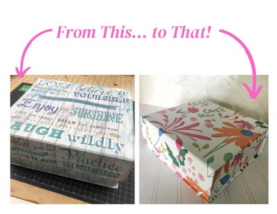 I received these generic plastic drawer units from a friend. The price was right (FREE!) but I really didn’t love seeing the stuff being stored in the drawers. I saw this pretty self adhesive wallpaper design and thought it would look nice with my daughter’s floral bedspread. I was really surprised by how well this actually worked out considering the only tools I had at my disposal were a kitchen scissors and a craft knife. The wallpaper was very easy to work with on this project because if I ended up with a a few small bubbles I could very easily peel it back a bit to get them out. The end result was so pretty! I still had a lot of paper left on the roll, so I was also able to upcycle the storage box shown in the next photos too! (I didn’t bother doing the entire inside of the box because no one will see it, but I easily could have since there is so much on the roll.)