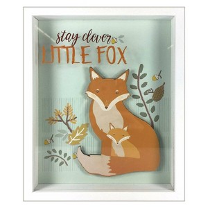 The fox is known in fable as the cleverest of all the woodland creatures. In the Stay Clever Little Fox Shadowbox with Lift from Linden Ave., an elevated fox and her kit are nestled in among the forest flora against a teal painted ground and framed in white. The saying “Stay Clever Little Fox” is painted in brown cursive and foxy orange tones on the glass for added dimension. Use this art alone or in partnership with Stay Kind Little Bunny and Stay Wise Little Owl. Work smart and with heart little one.