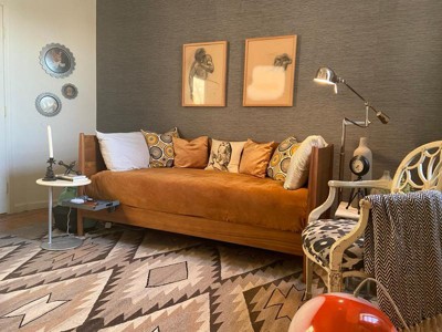 ...is it what I would say if I didn’t have to go to work or cook dinner or feed my cat, because this wallpaper seriously makes me want to never leave my bedroom. I’ve installed quite a few wallpaper projects, and this self-adhesive stuff is sooooo much easier than the mucky pasty way of doing it. I had used self-adhesive stuff way back when there were, like, two patterns in the whole world, and it had always looked kind of cheap, but the stuff that’s out now is not only cheap-and-easy, but is of top quality and sophistication! The grasscloth looks super-realistic (although the paper is in no way textured, it still looks textured just by the nature of the pattern), and the matching was beyond easy, primarily because there is no need for matching a grasscloth. Anyways, here’s a pic of the fabulous feature wall. I’ve blurred out any racy parts from the artwork, just in case y’all think I have random pictures of the color “light sienna” on my wall.