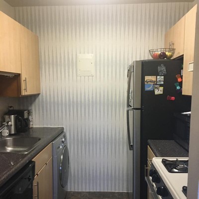 I bought this wallpaper bc I am renting and did not want to paint the walls but still wanted to bring in color and texture into my rooms. I chose this one for our kitchen accent wall. I loooove the way it turned out! I applied it by myself, but if you can get a helper, I’m sure it’ll save you half the time and stress. I opened 2 rolls but only used a little over 1, just to make sure the print lined up. It is thick and was easy to peel off to realign, and it has been staying on the walls 3 weeks later. The best part? The beige in the wallpaper is the same beige painted on apartment walls so it blends in so well! I just wish it was more affordable to cover larger walls.