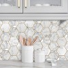 Honeycomb tiles create a unique finish for any countertop space, and now the look is achievable in as little as peel, stick, done! Hexagon peel and stick backsplash tiles create the look and feel of authentic tile at a fraction of the cost and without the need for professional tools. 4 Tiles 10.5 inch x 10.5 inch. ; Four Tiles Per Pack - RoomMates StickTiles include four individual 10.5 inch x 10.5 inch self-adhesive tiles per pack.; Remodel Your Kitchen & Bathroom - An easy way to redecorate, RoomMates StickTiles adhere to any clean, smooth surface.; No Hassle DIY - A traditional backsplash is hard to install and expensive. With our StickTiles, you can makeover your kitchen AND bathroom at a more affordable price!; Easy to Apply - No grout or wet saw needed, just peel and stick! Easily trim with a sharp blade to fit any space.; Realistic Appearance - Our StickTiles have a textured finish to achieve the look of real tile on a wall.; Material - Each tile is made of flexible vinyl, which is both washable and water resistant.; ; .