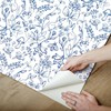 - Renter-friendly and removable peel and stick wallpaper with a blue and white floral damask design.