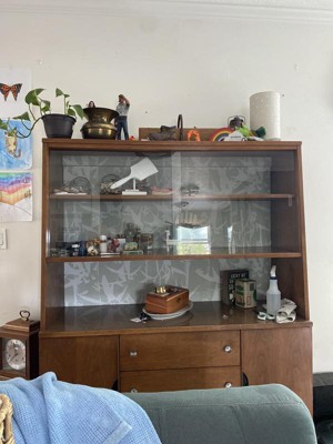 I got this to brighten and add interest to the back of this vintage hutch after testing a sample from a previous installation for over a year to make sure I wouldn’t ruin the original. After it continually came off clean, I picked out a nice light pattern and went to work. I actually really enjoy this pattern; it’s easy to line up and you cannot tell where the seams are, even up close. Now on to styling!