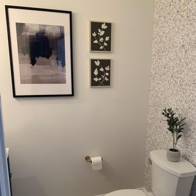 While the colors were a little duller in person than I expected, this wallpaper ended up being perfect for our half bath. There are definite beige undertones and the colors aren’t quite as crisp as photographed in the product image. It was super easy to measure and cut using an exacto-knife and apply/reposition as needed. This was my first experience using peel and stick wallpaper and I’d absolutely do it again. The seams are hardly noticeable and this print is very forgiving.