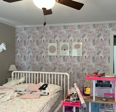 Enchanted unicorns prance through wildflower fields in this magical Unicorn Paradise peel and stick wallpaper by Clara Jean Designs from RoomMates. Barely blush pink unicorns with golden horns frolic amidst pastel tones on pink cone flowers, lavender and golden bell flowers, Queen Anne s lace and sprigs of eucalyptus leaves on a soft pale pink background. The design is whimsical and suitable for children s playrooms, bedrooms or any room in the house where a little whimsey is desirable. RoomMates peel and stick wallpapers are an easy and affordable way to decorate. Peel off the paper backing and smooth onto the wall, no additional adhesive required. When it s time to redecorate, simply remove them effortlessly in full strips with no remaining sticky residue or damage to walls. Meet Shauna and Afton, the mother and daughter duo behind Clara Jean Designs. Located in the Bay Area, they use a variety of mediums to create their designs, their favorites being watercolor and oil paint. They love to create art that is a reflection of the joy and beauty all around them. Named for Afton's daughter, the Clara Jean brand can be described as soulful, vibrant, and colorful.