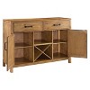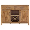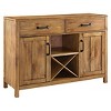 Modern simplicity meets rustic charm with the Roots Sideboard. A wood-grain look is applied to the buffet cabinet by hand, while substantial metal hardware incorporates an element of industrial chic. Two large drawers and two cabinets with adjustable shelves are ideal for tucking away kitchen items. The open center shelf is great for display, while the removable wine storage compartment comfortably holds four wine bottles. Beautifully crafted, the simple design of this credenza will blend with a variety of home décor.