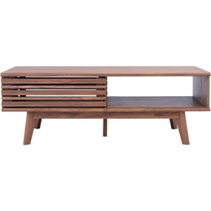 Retro chic style meets artistic negative space in this Rori Coffee Table. Abounding with depth and dimension, Rori provides your living room with ample storage its one discreet shelf, and a rich walnut finish ensures Rori perfectly accents any decor's color scheme. Care Instructions: Dust regularly with a soft, dry cloth. Never use oiled or treated cloths on lacquered finishes. Some finishes can be wiped with a damp (not wet) cloth, followed at once by rubbing with a dry cloth to remove fingerprints and smudges. For persistent spots, gently clean with a soft cloth and a solution of water and mild soap, make sure to wipe dry. Use adhesive felt pads, coasters and placemats to protect your furniture.