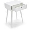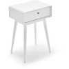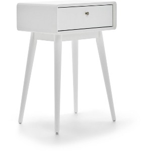 Functional simplicity at its finest. Discover the style and practical charm of this midcentury modern side table. It's simple lines and white finish easily coordinate with any decor. No matter what look your favor, this small square accent table can help you achieve it. Its compact dimensions make it perfect for decorating any room, whether you have a large living room or a smaller apartment or condo. Its size also makes it very portable, so it's perfect for renters and regular redecorators. It might be small, but don't underestimate the practicality of this nightstand with storage. Decorate the top with framed photographs, then stash magazines, remotes, and other items inside its single drawer.