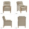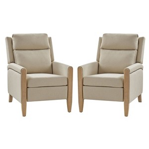 The transitional-style recliner is upholstered in 100% polyester fabric for durability. This manual recliner offers two positions for your relaxation needs, functioning as a push-back recliner. The unique solid wood legs feature a brushed finish, showcasing the natural beauty of the wood while ensuring durability. The legs are asymmetrically designed, with the rear legs curving gracefully backward for added visual interest. Nailhead trims along the edge of the armrest add a touch of sophistication to the overall aesthetic. Experience comfort with the high-density foam and spring support, great for extended lounging. With its segmented backrest, you can adjust the recliner to your preferred angle with ease. Whether unwinding after a long day or enjoying a leisurely afternoon, this manual recliner is a delightful addition to the home office.