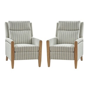 The transitional-style recliner is upholstered in 100% polyester fabric for durability. This manual recliner offers two positions for your relaxation needs, functioning as a push-back recliner. The unique solid wood legs feature a brushed finish, showcasing the natural beauty of the wood while ensuring durability. The legs are asymmetrically designed, with the rear legs curving gracefully backward for added visual interest. Nailhead trims along the edge of the armrest add a touch of sophistication to the overall aesthetic. Experience comfort with the high-density foam and spring support, great for extended lounging. With its segmented backrest, you can adjust the recliner to your preferred angle with ease. Whether unwinding after a long day or enjoying a leisurely afternoon, this manual recliner is a delightful addition to the home office.
